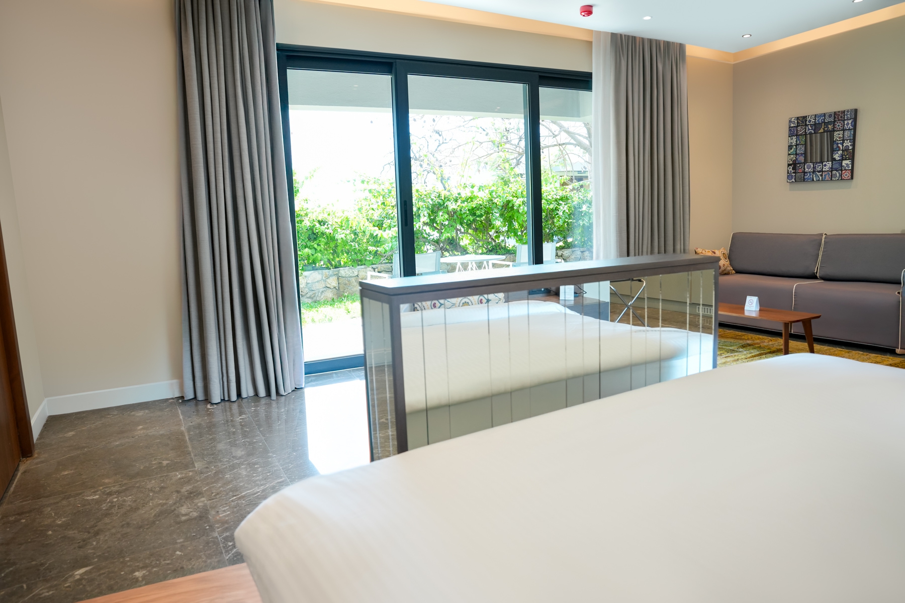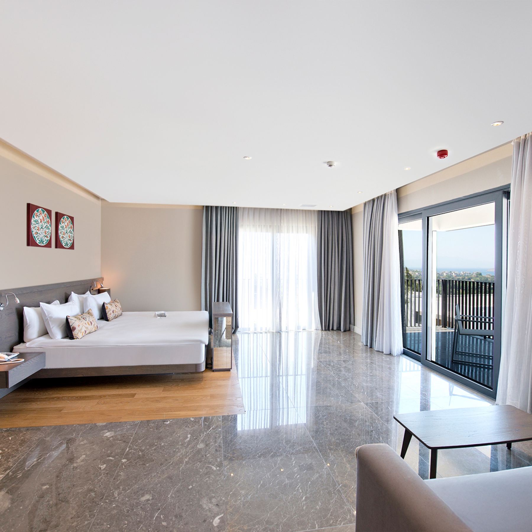 Bitez’in huzurlu manzarasına sahip bu özel süit, daha büyük bir alana ihtiyaç duyan konuklarımız için idealdir. Pastel renklerle dekore edilmiş dinginliğin hakim olduğu oda, konforlu bir kanepe ve yemek masasının da yer aldığı oturma alanına sahiptir.